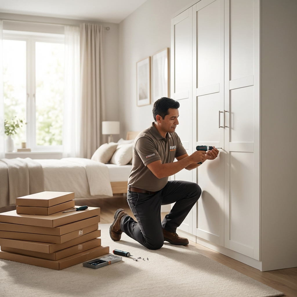 • Montagem de guarda-roupas, camas, estantes, painéis, racks, armários de cozinha, mesas, cômodas e outros móveis
